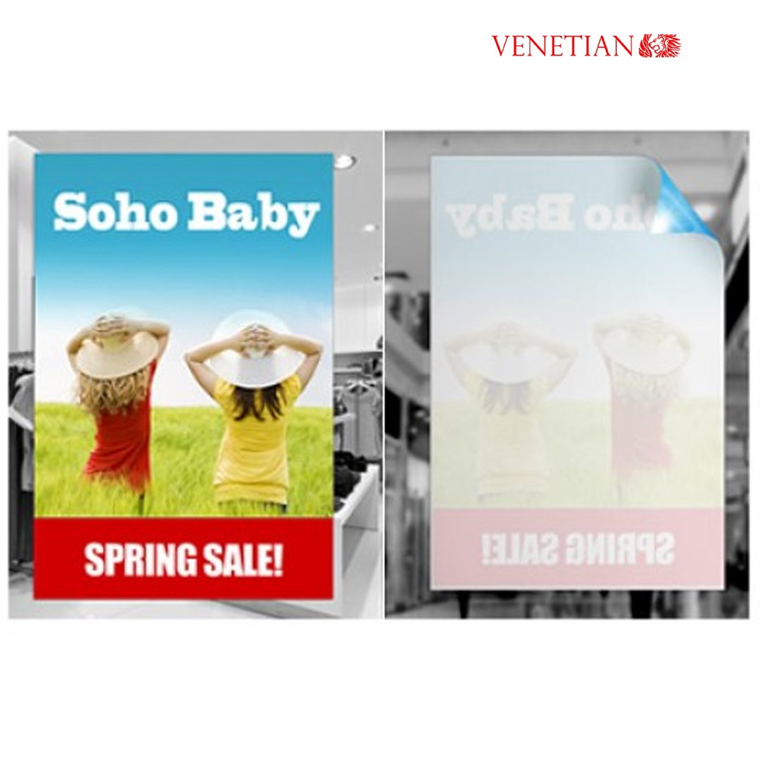 Venetian White Static Cling is made from an semi-translucent material. Window clings are designed to seamlessly showcase logos, fonts, and designs without messy adhesive. Window clings are designed for non-adhesive application while providing a secure ‘cling’ to the window, making for easy placement, removal, and re-positioning or re-use. Custom window clings can be displayed on glass, plastic, or any other non-porous surface for temporary or long-term use.